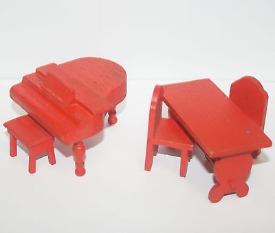 Vintage Antique Wood Wooden Red Dollhouse Furniture Table Chair Grand Piano Old