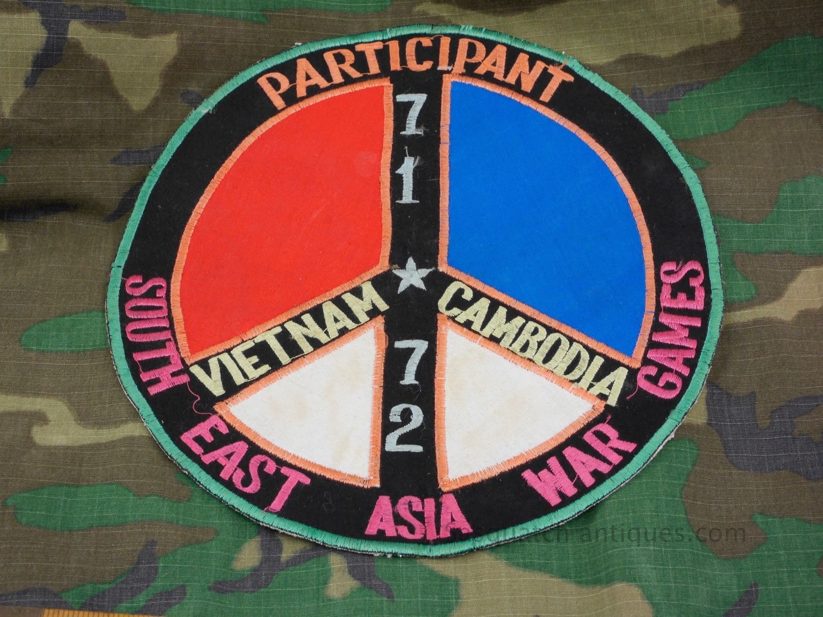 Title (ebay affiliate link): LARGE 9" VIETNAM PARTY SUIT '71 72 WAR GAMES PARTICIPANT PEACE SYMBOL PATCH