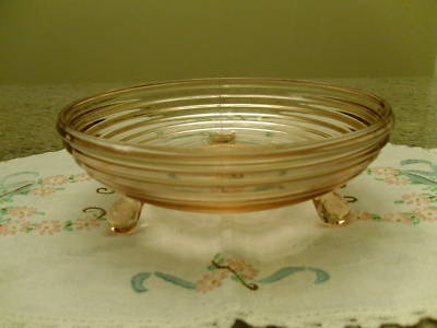 Title (ebay affiliate link): Pink Depression Glass Manhattan 3 Legged Candy Bowl