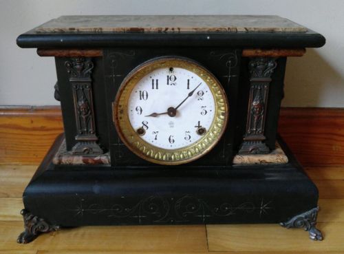 Title (ebay affiliate link): ANTIQUE 1880'S SETH THOMAS BLACK MARBLE LIKE TAN No.102 ADAMANTINE MANTEL CLOCK