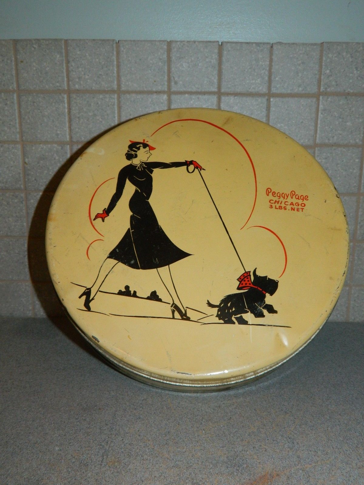 Title (ebay affiliate link): Vtg PeggY PaGE TiN Chicago 3 Lbs. Scottish Terrier 1940's 9 1/2" Round TiN CandY