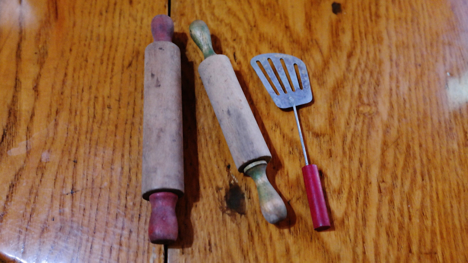 Title (ebay affiliate link): Vintage Child's Wood ROLLING PIN Red & Green Handles & Spatula with Red Handle