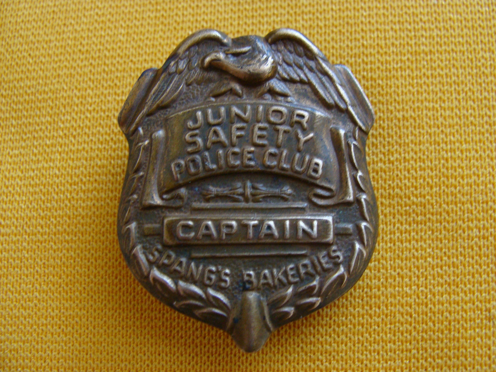 Title (ebay affiliate link): 1930s-40s Spang's Bakeries Junior Safety Police Club "Captain" Brass Premium Bad