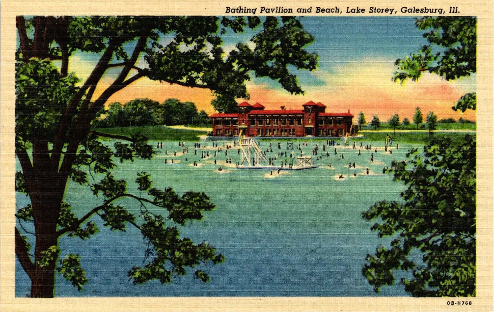 DR JIM STAMPS US PAVILION & BEACH LAKE STOREY GALESBURG ILL LINEN POSTCARD