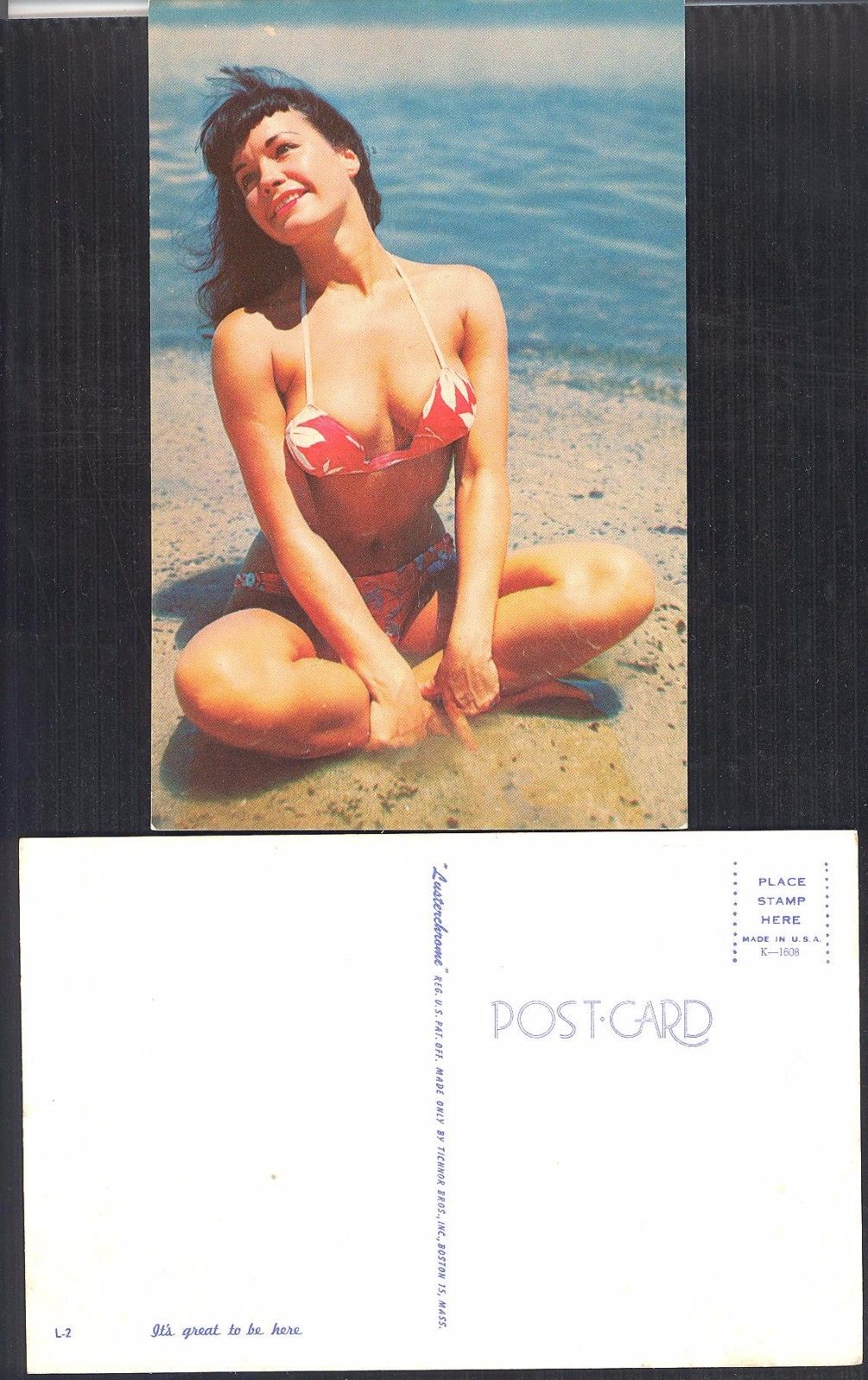 Title (ebay affiliate link): VINTAGE BETTY PAGE COLOR POST CARD C1958 UNUSED BATHING BEAUTY IMAGE