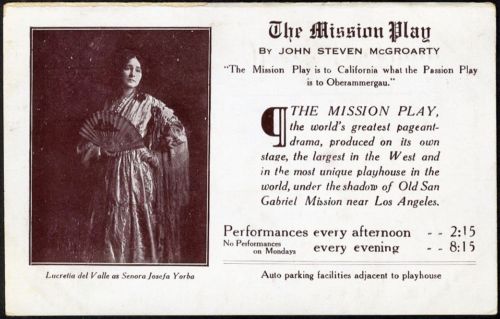 Title (ebay affiliate link): MISSION PLAY San Gabriel Mission Postcard Advertising c 1910 Lucretia del Valle
