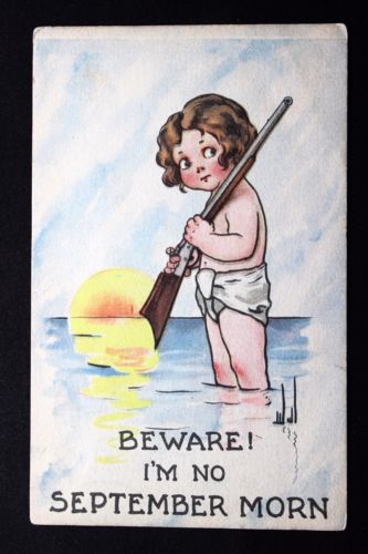Title (ebay affiliate link): c.1914 Comic Postcard Baby Holding a Shotgun BEWARE! I'M NO SEPTEMBER MORN