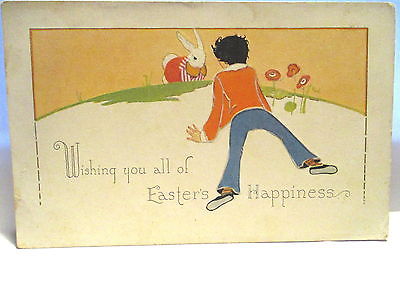 1910 POSTCARD ALL OF EASTER'S HAPPINESS, BOY LAYING ON HILL, WHITE BUNNY
