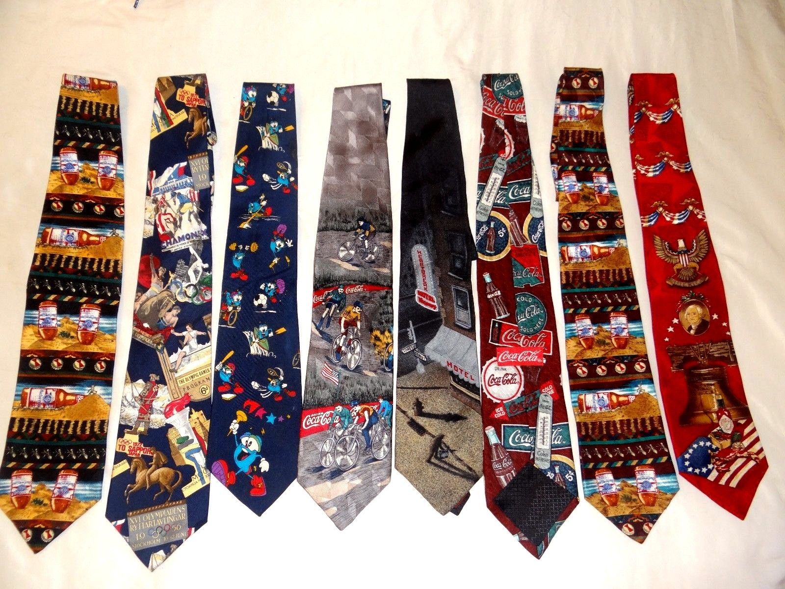 Title (ebay affiliate link): LOT OF 8 NOVELTY TIES, COCA COLA-OLYMPIC GAMES COLLECTION-BUDWEISER-ELVIS