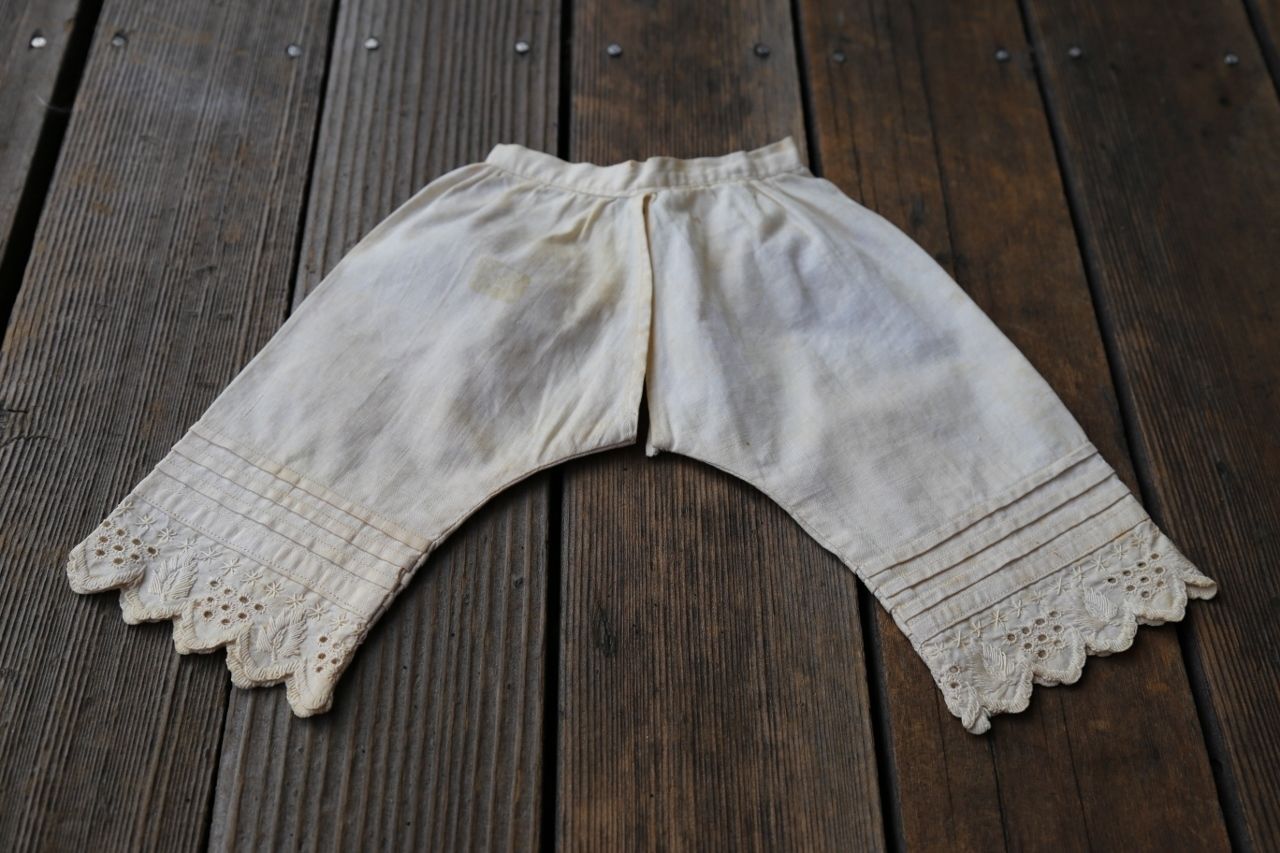 Title (ebay affiliate link): Lovely Antique Off White Cotton DOLL PANTALOONS Undies Pintucks Fine Cutwork Hem