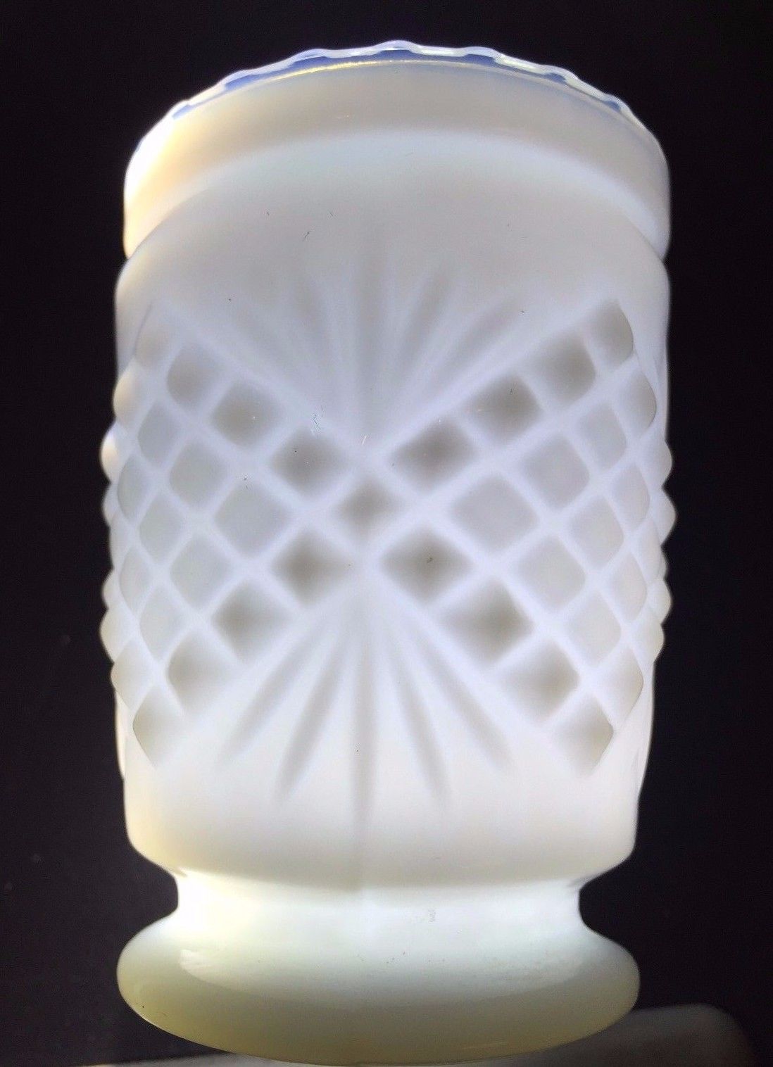Title (ebay affiliate link): Rare Diamond Quilt Rays Milk Glass Toothpick Vase/Holder Slightly Translucent