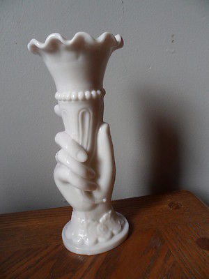 Title (ebay affiliate link): Vintage Fenton Opaque White/pink Milk Glass, Victorian Ladies Hand Holding Vase