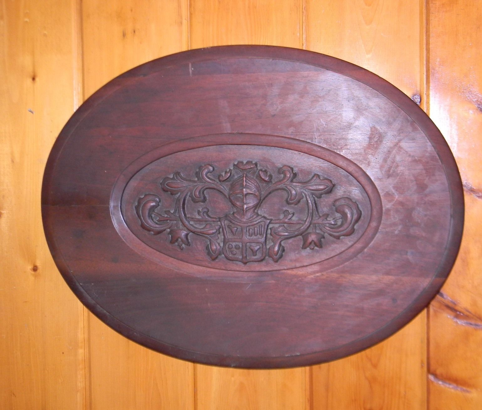Vintage Carved Walnut Table Top English Man In Suit Of Armor Oval Sculpture