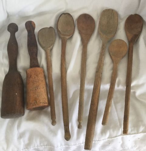 Title (ebay affiliate link): 8 Antique Vintage Primitive Farmhouse Country Wood Wooden Spoons Tools