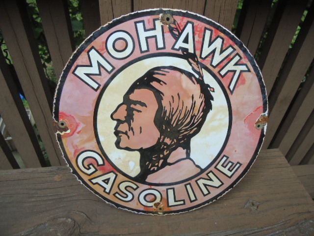 1940'S MOHAWK GASOLINE PORCELAIN GAS PUMP SIGN