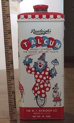 Title (ebay affiliate link): Rawleigh's Talcum Powder Tin, 14 Oz size, Freeport IL. Clown & Circus Animals