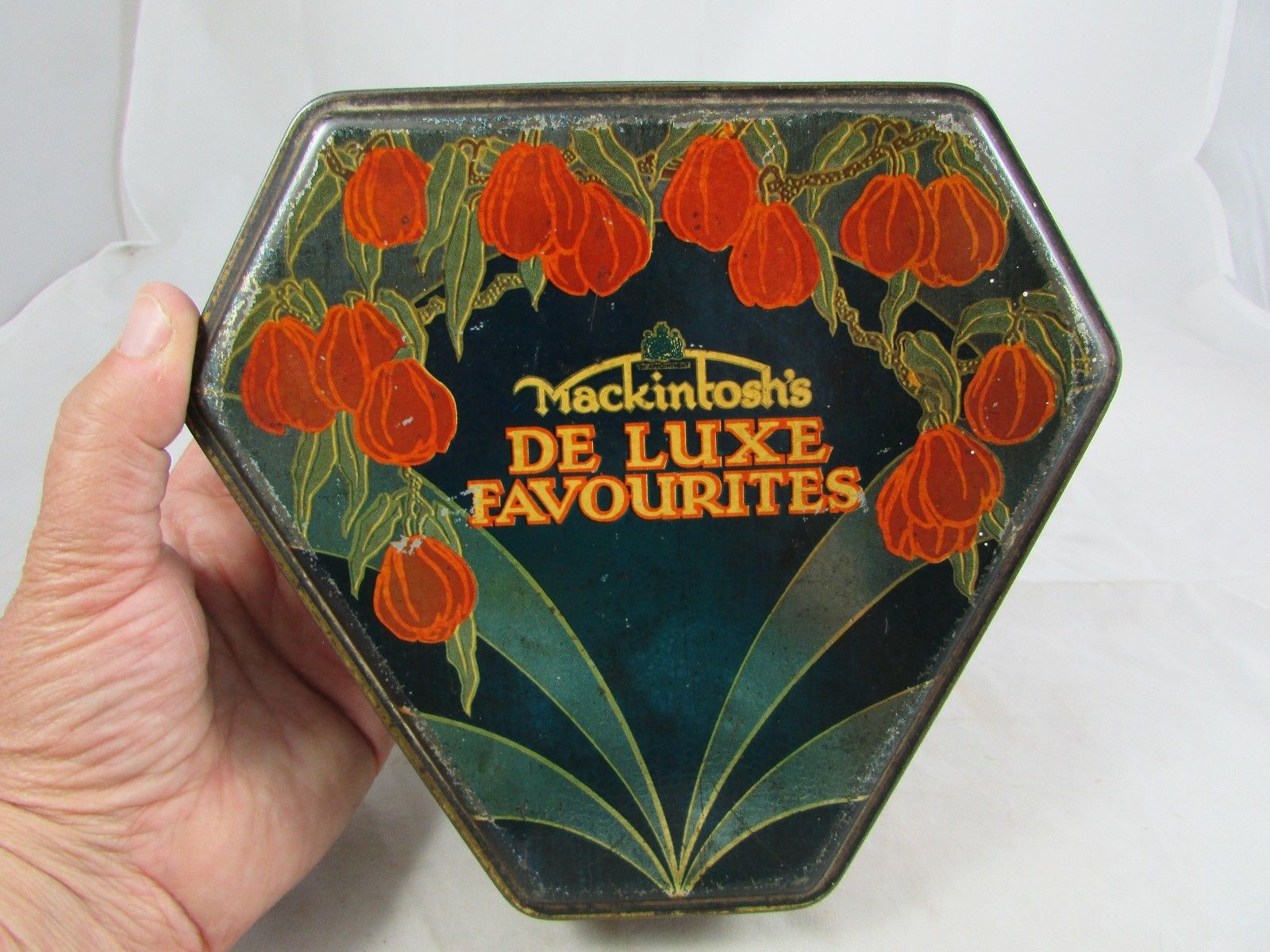 Title (ebay affiliate link): Antique Candy Tin Box Container Mackintosh's De Luxe Favourites Halifax England