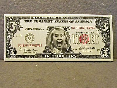 one HILLARY CLINTON $3 dollar bill vintage 1998 fake money parody novelty