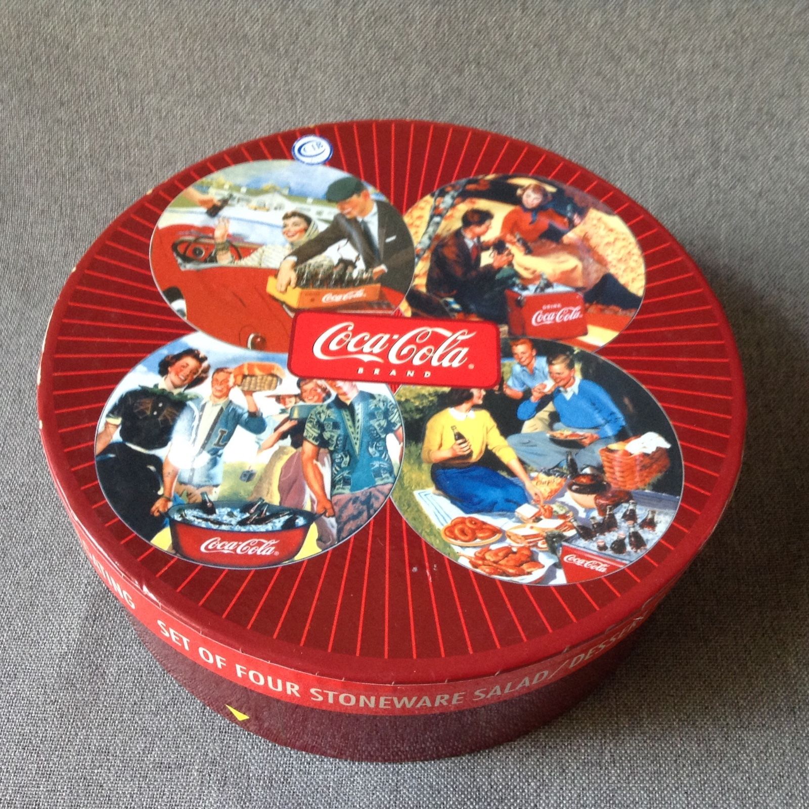 Title (ebay affiliate link): A SET OF FOUR COCA COLA 'Tailgating' STONEWARE SALAD DESSERT PLATES Never Used