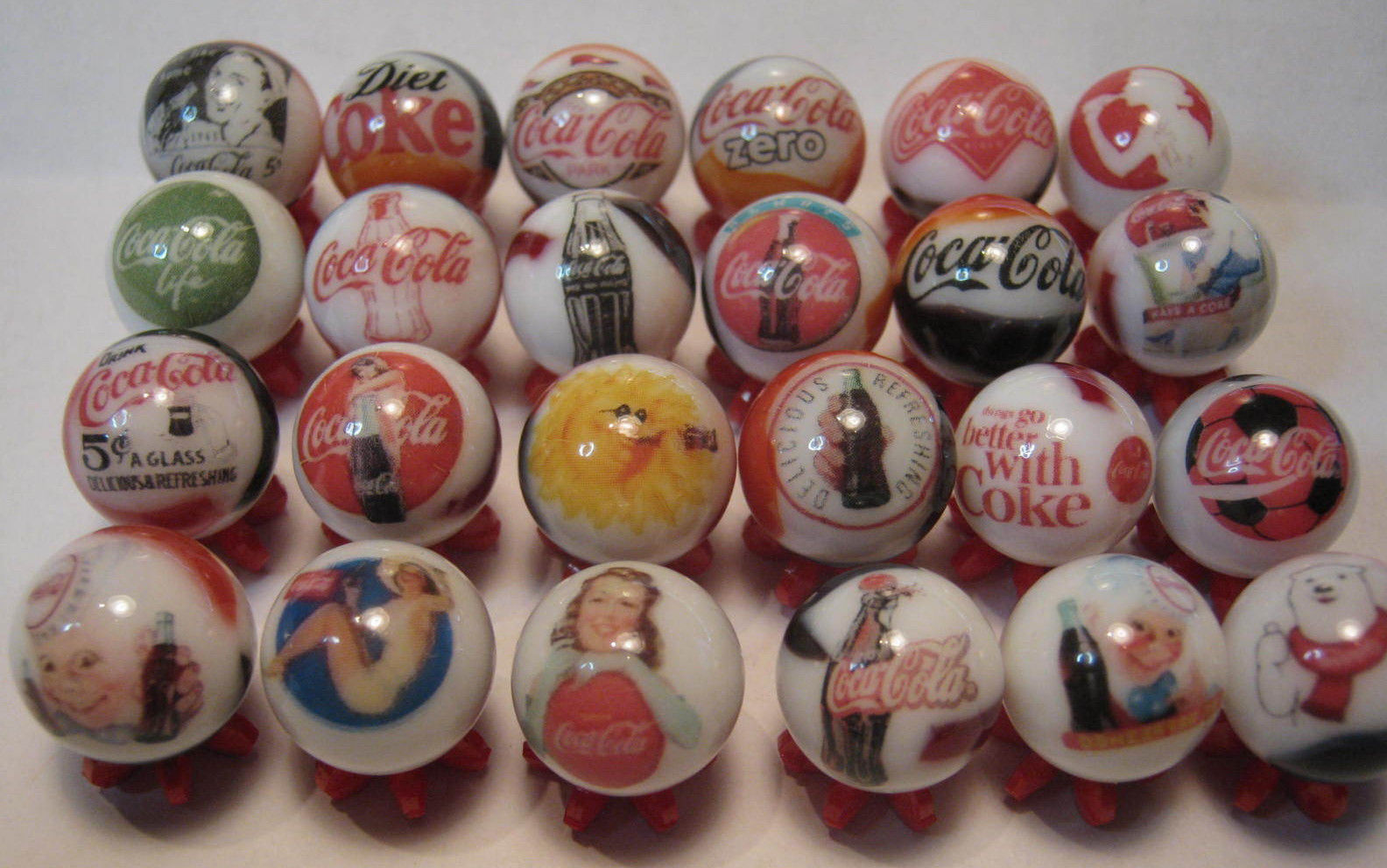 Title (ebay affiliate link): 24 COCA COLA SODA POP GLASS MARBLES 5/8 SIZE COLLECTION LOT + STANDS