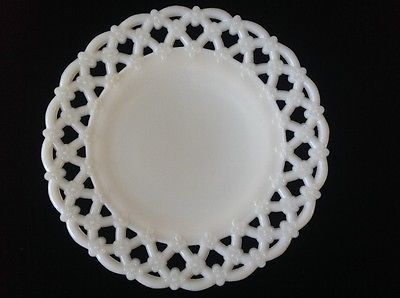Title (ebay affiliate link): VINTAGE WESTMORELAND LACE EDGE WHITE MILK GLASS 8.5" PLATE FORGET ME NOT