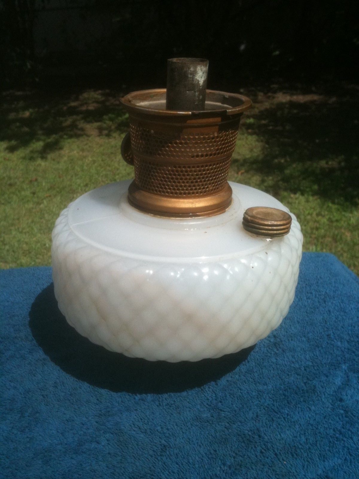 Title (ebay affiliate link): VINTAGE ALADDIN KEROSENE B BURNER PART & QUILTED WHITE MILK GLASS TANK AS IS