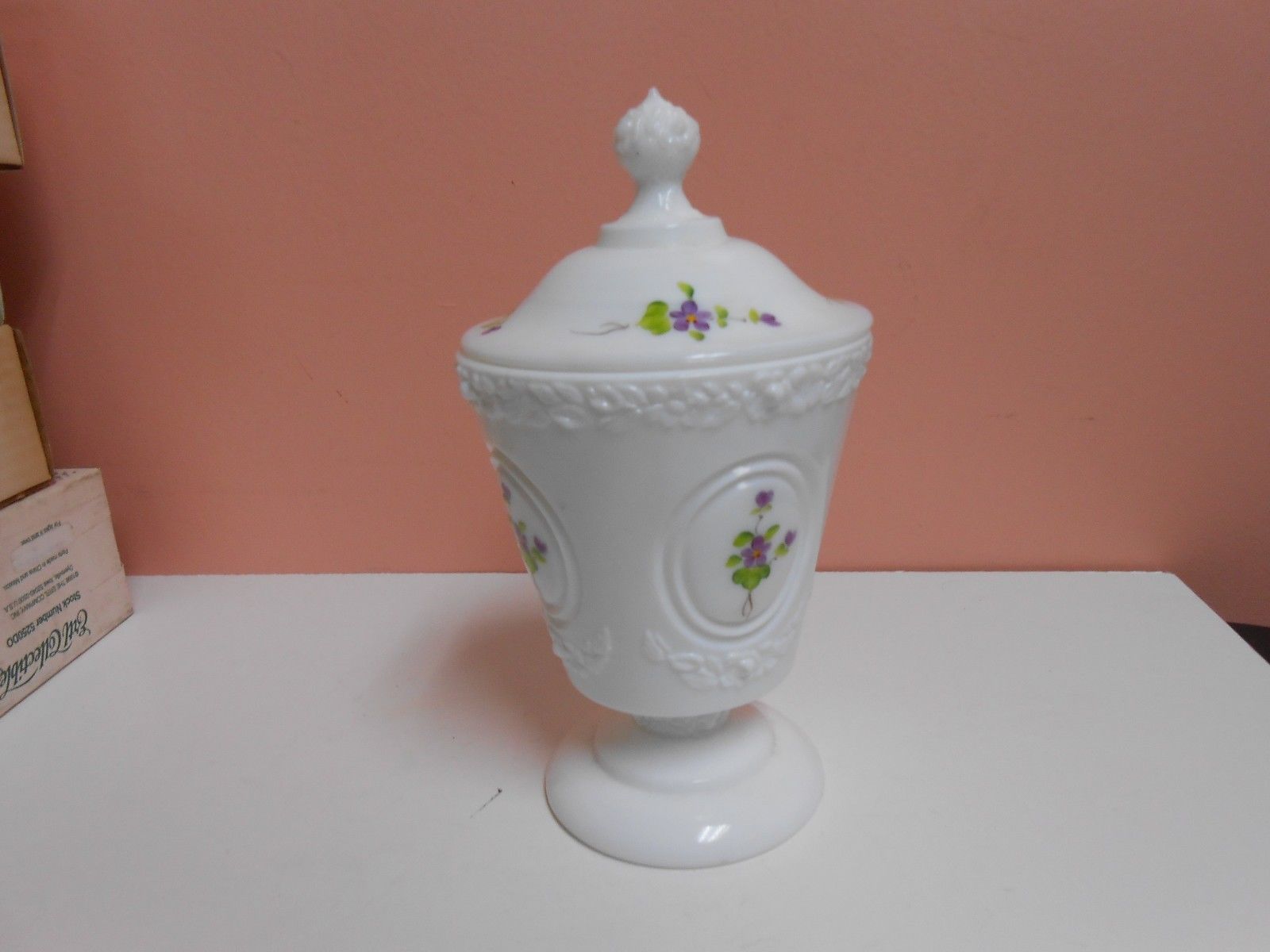 FENTON WHITE MILK GLASS COVERED FOOTED CANDY JAR PURPLE FLOWER DESIGN 8 1/2" T