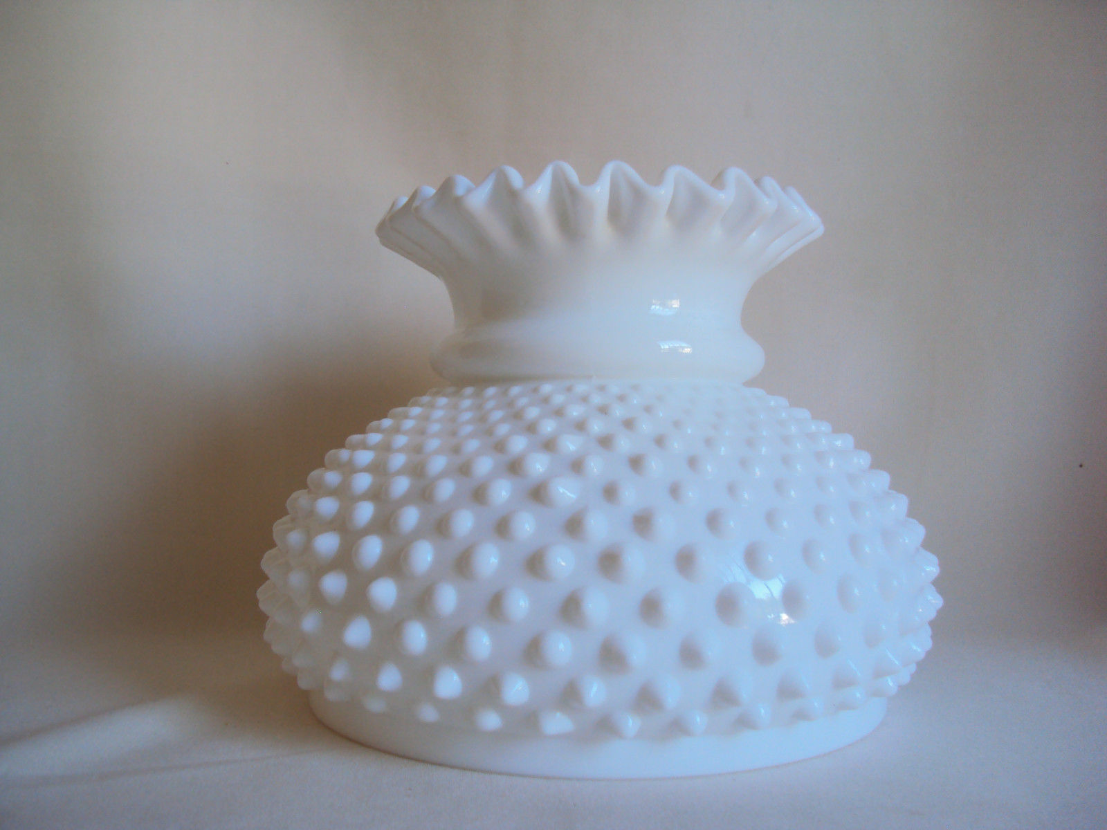 Title (ebay affiliate link): VINTAGE FENTON HOBNAIL MILK GLASS RUFFLED TABLE HURRICANE POLE LAMP SHADE