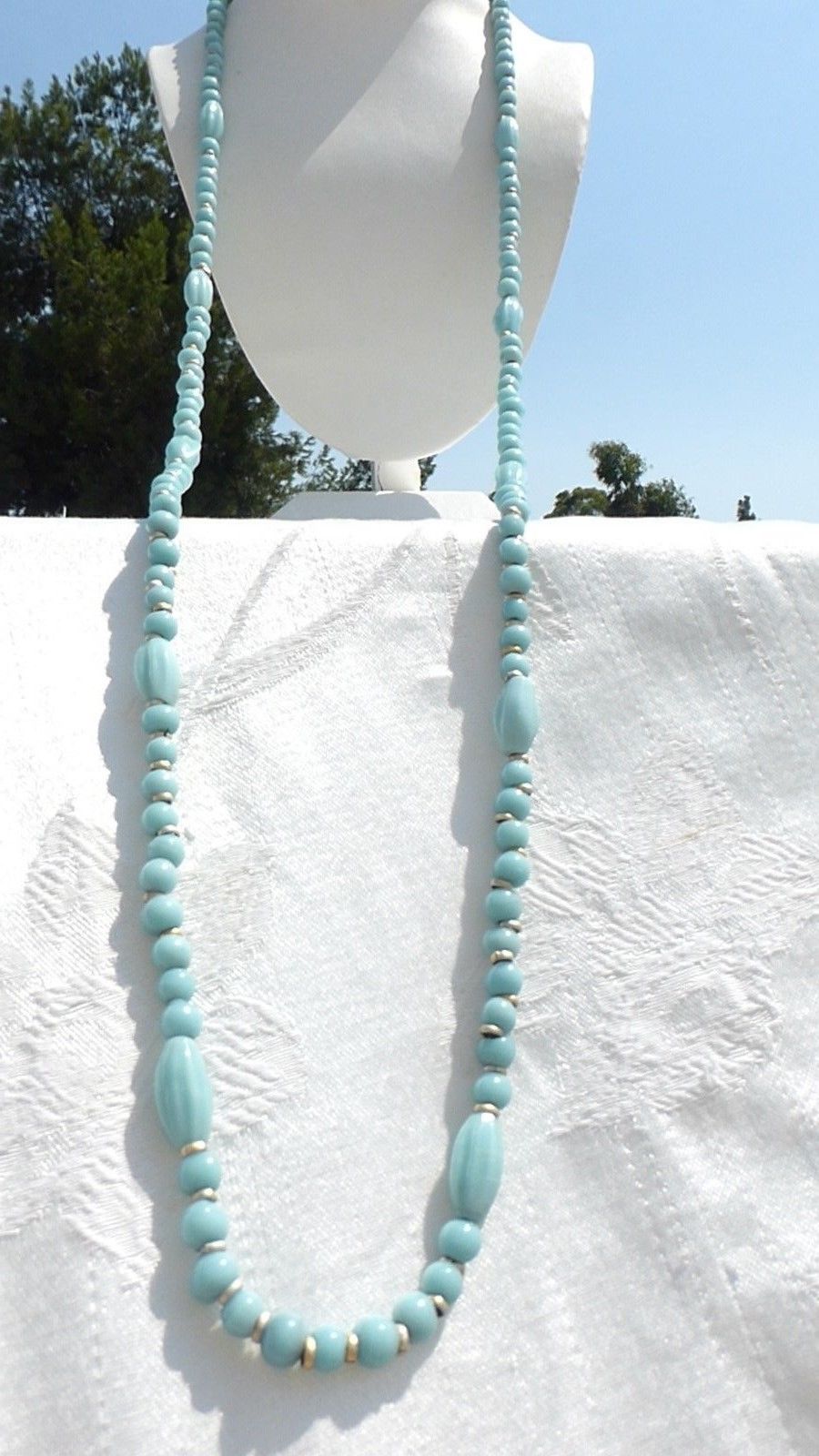 Title (ebay affiliate link): MAGNIFICENT Vintage BLUE MILK GLASS BEADED Silver spacers NECKLACE Gorgeous on