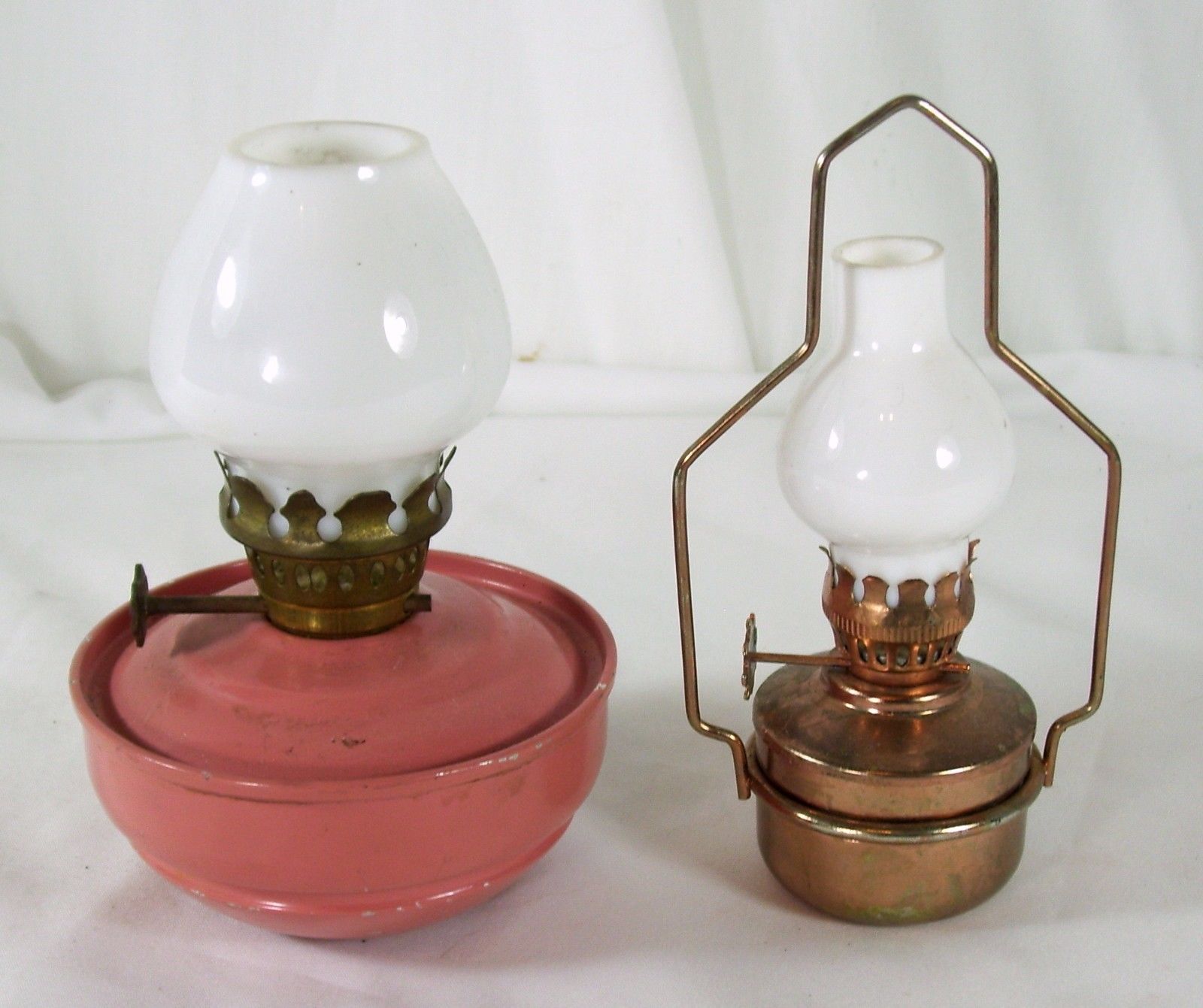 Lot 2 Vtg Mini Oil Lamps Hanging Metal Milk Glass Hurricanes Wicks Pink Enamel