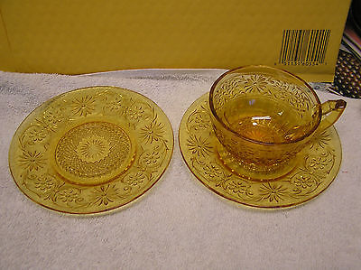 Amber Daisy Indiana Depression Glass Coffee Cup and two Saucers