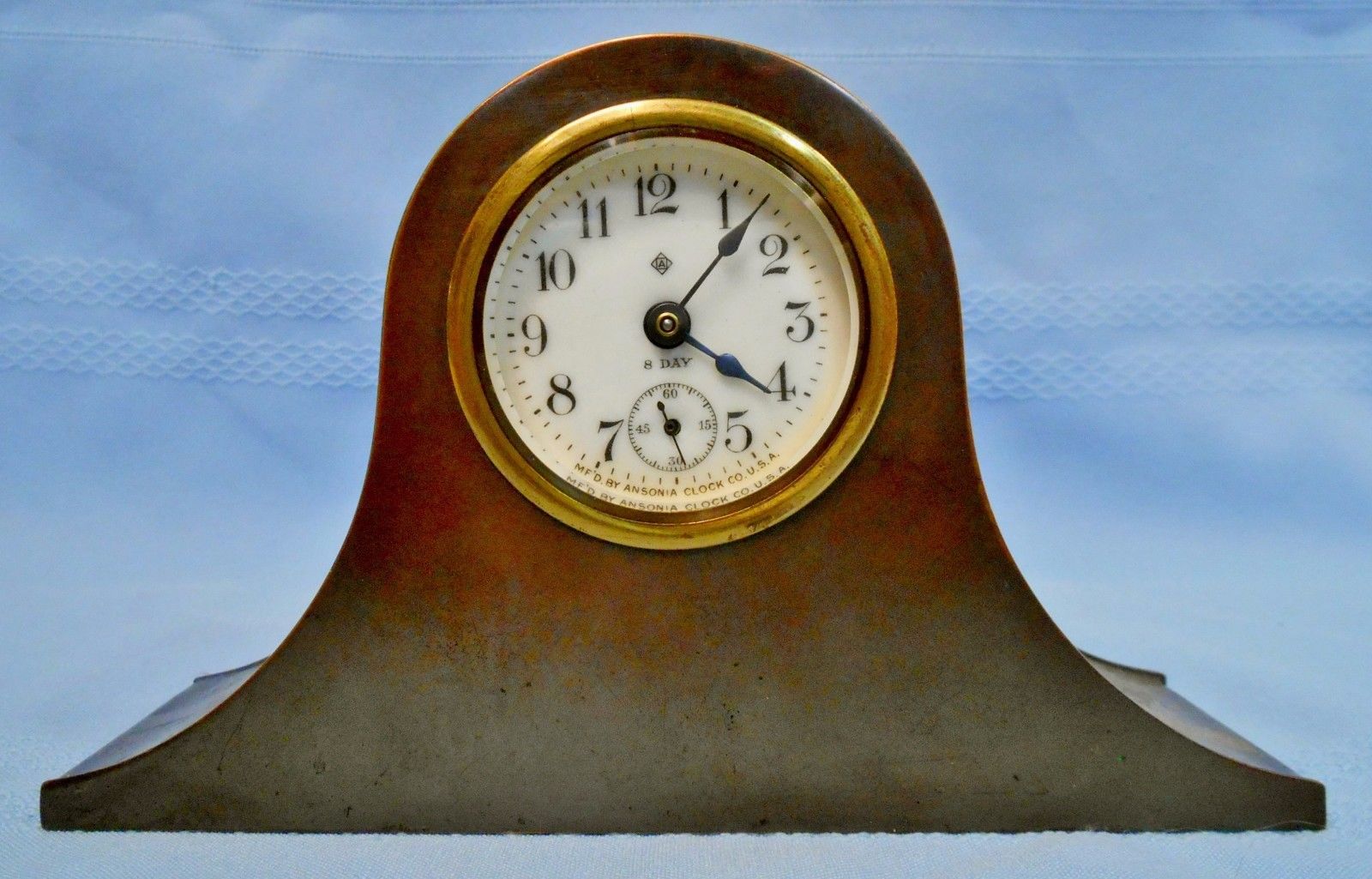 Title (ebay affiliate link): CUTE LITTLE 8-DAY WINDING ANSONIA CERAMIC FACE COPPER FINISH BRASS DESK CLOCK