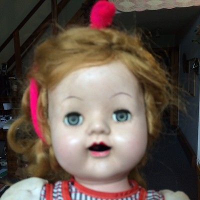 Title (ebay affiliate link): Vintage Antique COMPOSITION DOLL Girl 19'' eyes close has noise maker Clothes