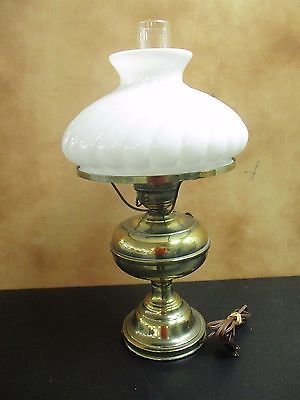 Title (ebay affiliate link): ANTIQUE LAMP CONVERTED ANTIQUE BRASS OIL LAMP WITH MILK GLASS SHADE TABLE LAMP