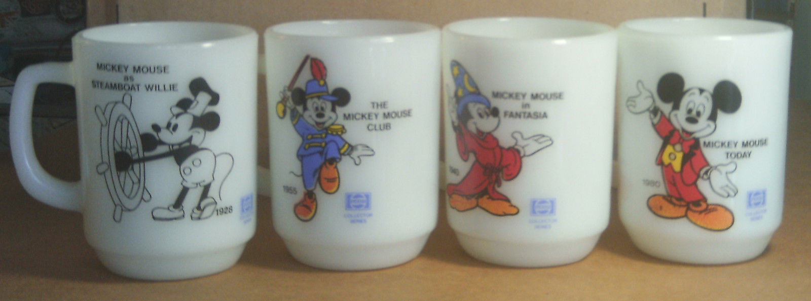 COMPLETE SET OF 4 Vintage 1980 MICKEY MOUSE MILK GLASS MUGS by Anchor-Hocking