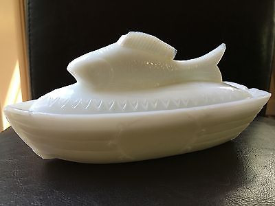 ESTATE SALE: Fish Boat/Rowboat/Fishing Covered Milk Glass Bowl/Dish (Ship)