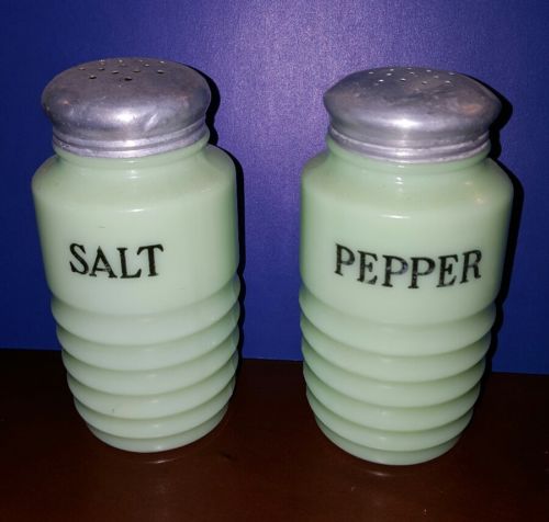 Title (ebay affiliate link): Vintage Jadeite Green Milk Glass Beehive Salt and Pepper Shakers