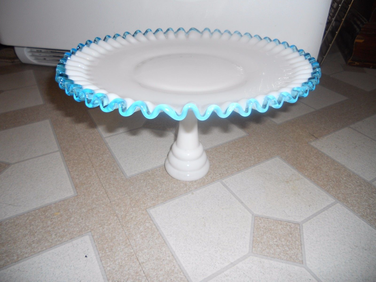 Title (ebay affiliate link): LARGE Fenton AQUA BLUE Crest Round Platter Cake Torte Plate 12" White Milk Glass