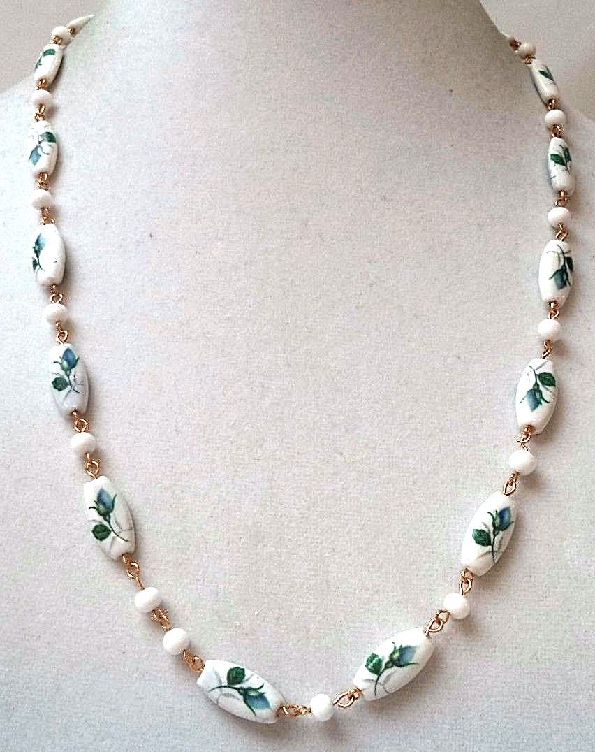 Title (ebay affiliate link): STUNNING VINTAGE ESTATE GOLD TONE MILK GLASS PAINTED FLOWER BEAD NECKLACE! 5817S