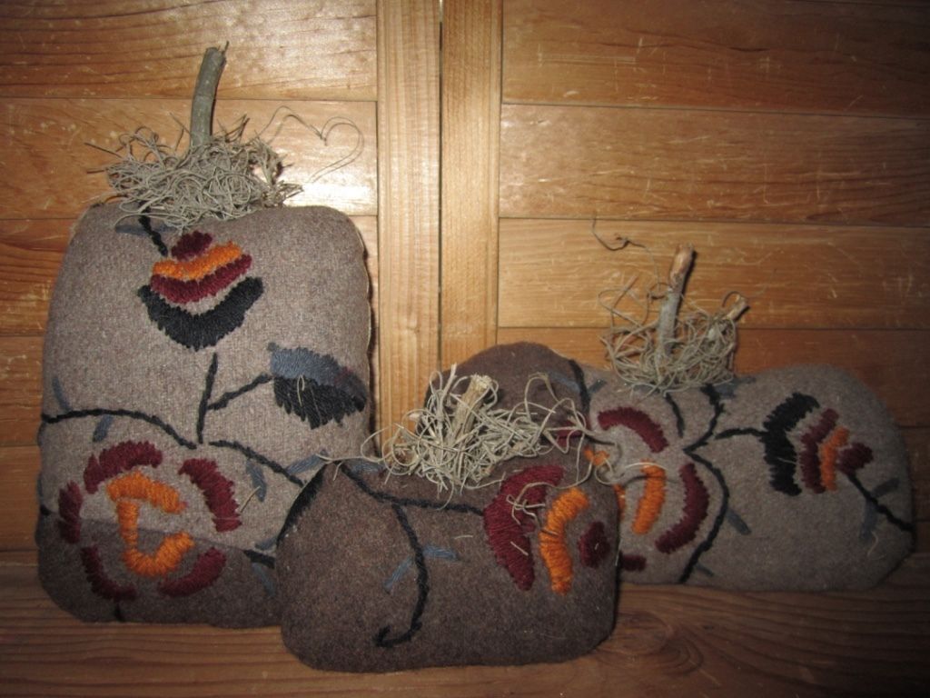 Title (ebay affiliate link): Primitive Pumpkins - set of 3 - Fall/Halloween - wool with stitched flower - 25