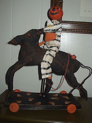 Title (ebay affiliate link): Primitive Folk Art Halloween Doll "The Candy Corn Caper" Pull Toy OOAK