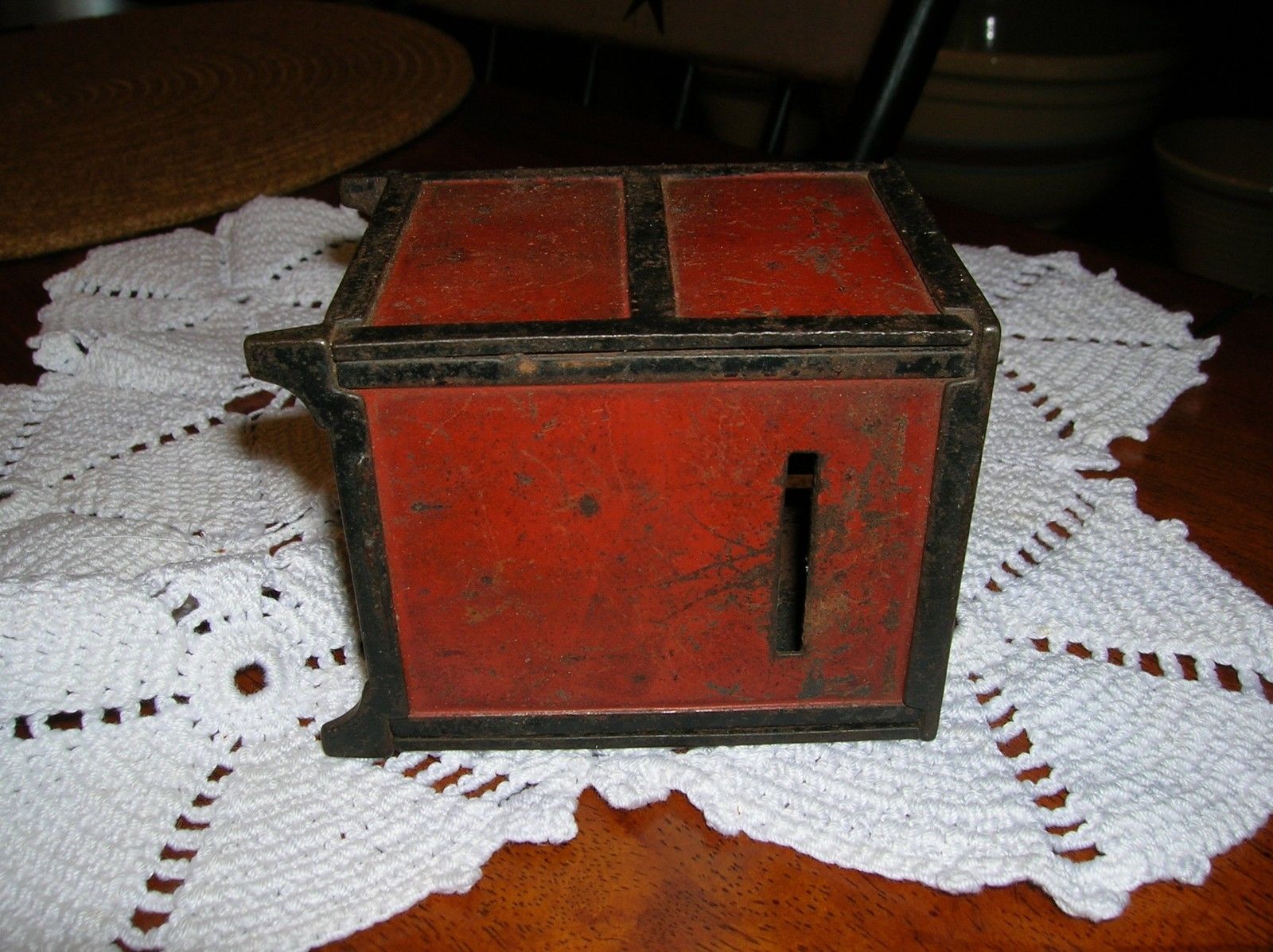 Title (ebay affiliate link): ANTIQUE VINTAGE CAST IRON STILL BANK SAFE ORIGINAL RED AND BLACK PAINT