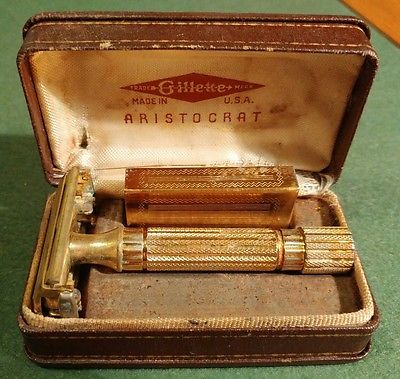 Title (ebay affiliate link): Vintage Gillette Aristocrat gold toned Safety Razor w/case and blade safe