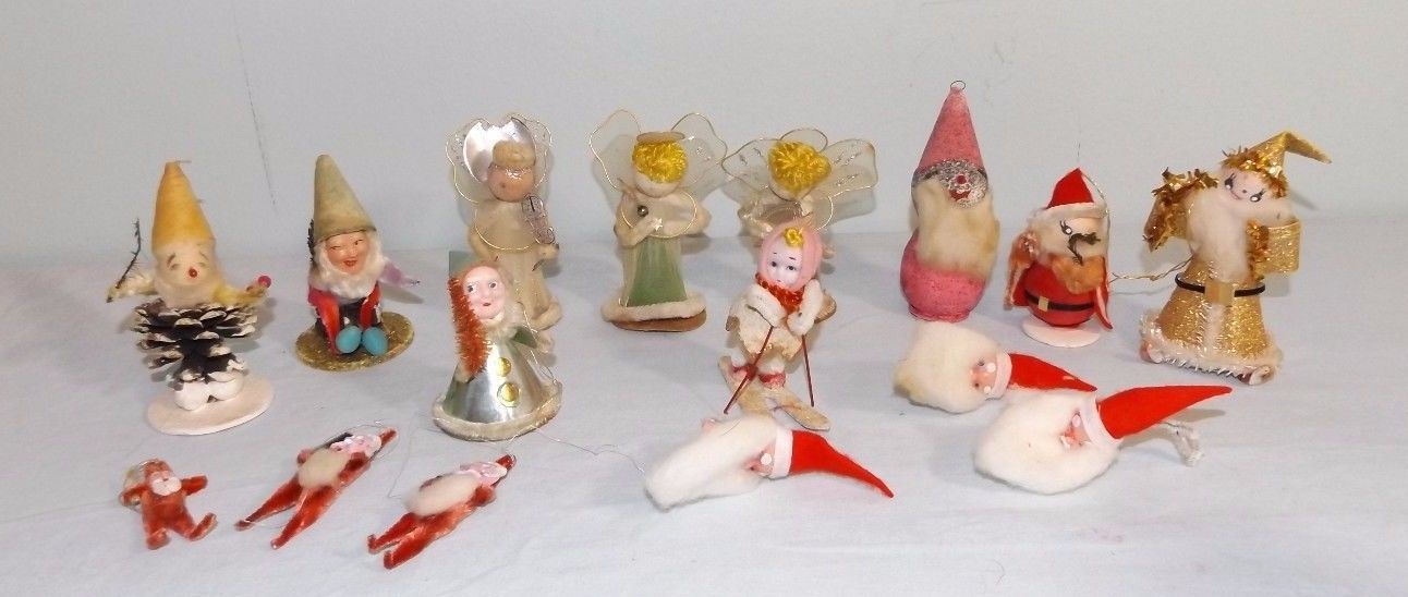 16 VTG Christmas Decorations Flocked Pipe Cleaner Angel Santa Skier Elf Japan