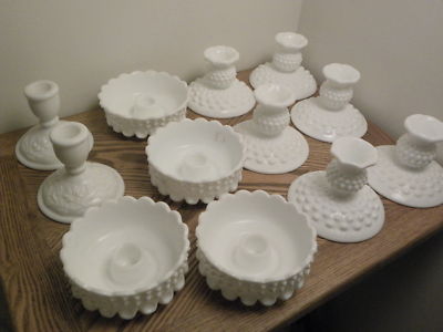 12 Pc Fenton & Imperial Milk Glass Candlestick bowl Lot