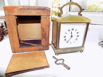 ANTIQUE C1900 FRENCH BRASS & GREEN MARBLE 8 DAY CARRIAGE CLOCK WITH CASE