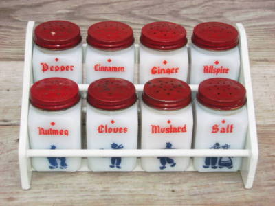 OLD MILK GLASS W BEAUTIFUL PYRO GRAPHICS SPICE JAR SET