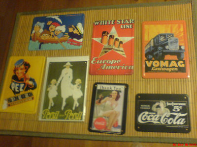 7 Reklame Blechschilder,Coca Cola,Persil,PEZ,Vomag,...