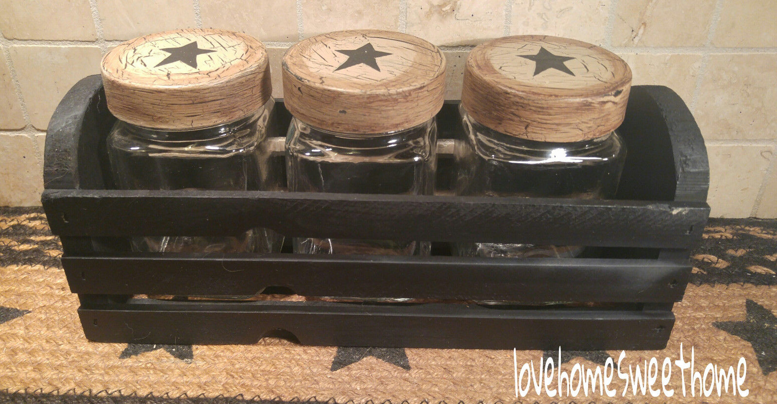 Title (ebay affiliate link): Primitive Crackle Tan & Black Stars Wood Crate & Glass Canister Set Country Deco