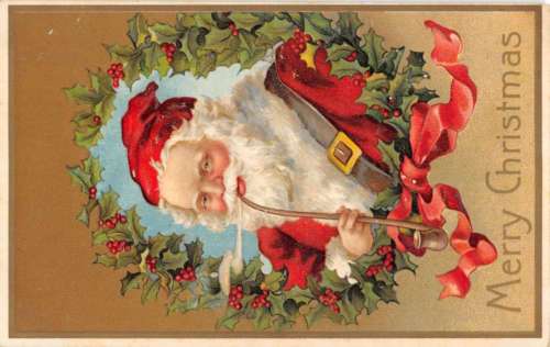Title (ebay affiliate link): Merry Christmas Santa Smoking Pipe Holly Wreath Antique Postcard K39400